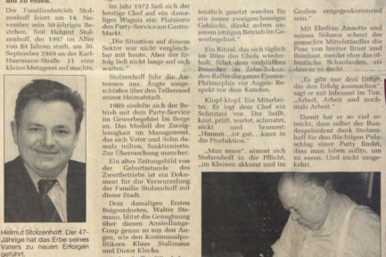 Es war die Zeit der Partys und des gemeinsamen Essens zu Hause und so entstand die Idee eines ersten Partyservices. Der Partyservice wurde zuerst aus der Garage des Wohnhauses betrieben. Was jedoch nicht auf Beifall der Eltern stieß. „So ein Quatsch” äußerte sich Helmut Stolzenhoff senior – wie sich sein Sohn Helmut heute noch erinnert. Aus dem „Quatsch” wurde eine Marktgröße, ein stattliches Unternehmen mit mittlerweile ca. 800 Angestellten. Neben dem Verkaufsladen am Hauptsitz, der Unternehmenszentrale an der Wethmarheide, und zwei Filialen in Lünen, sind 39 Locations für Veranstaltungen aller Art angeschlossen.