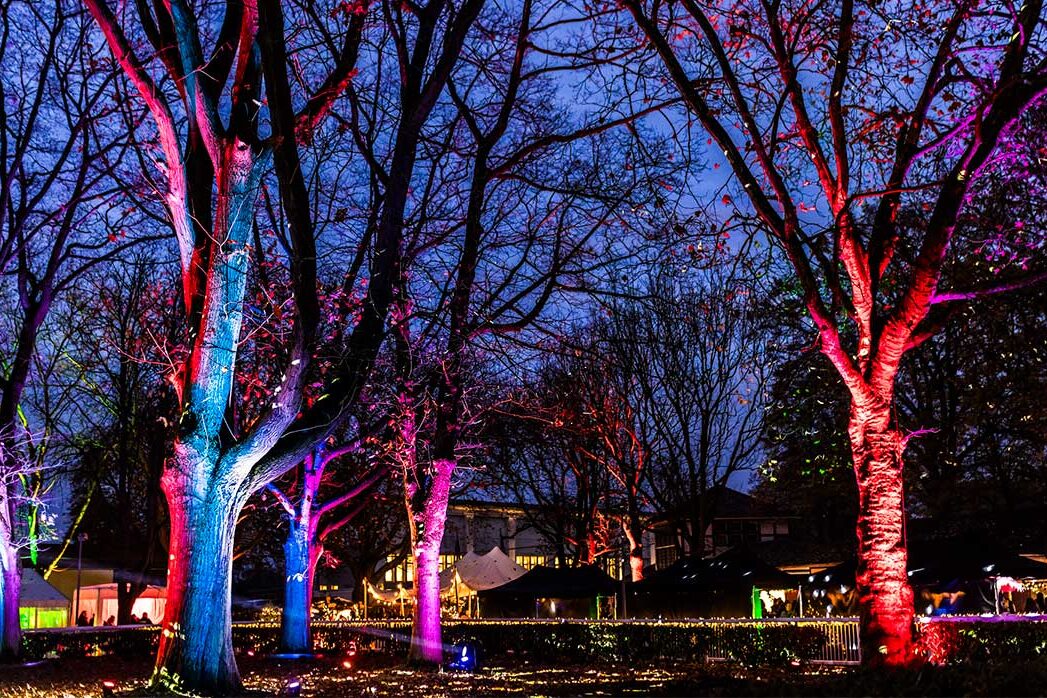 - Stimmungsvoll beleuchtete Weihnachtsbäume, atmosphärische Feuerschalen und festliche Dekoration